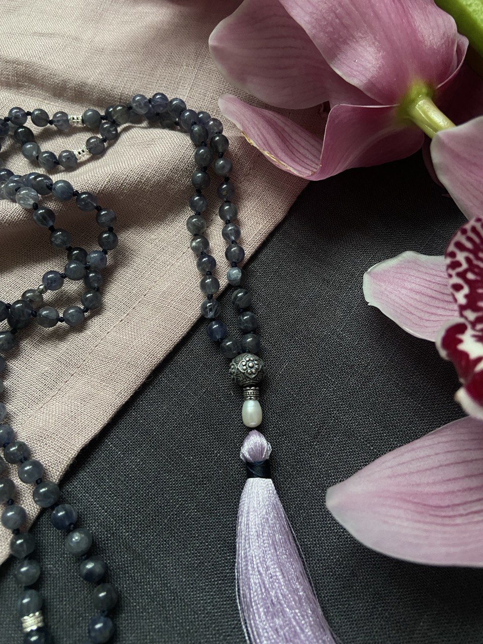 Мала - буддистские четки из 108 бусин. Эти четки выполнены из иолита, речного жемчуга и серебра.